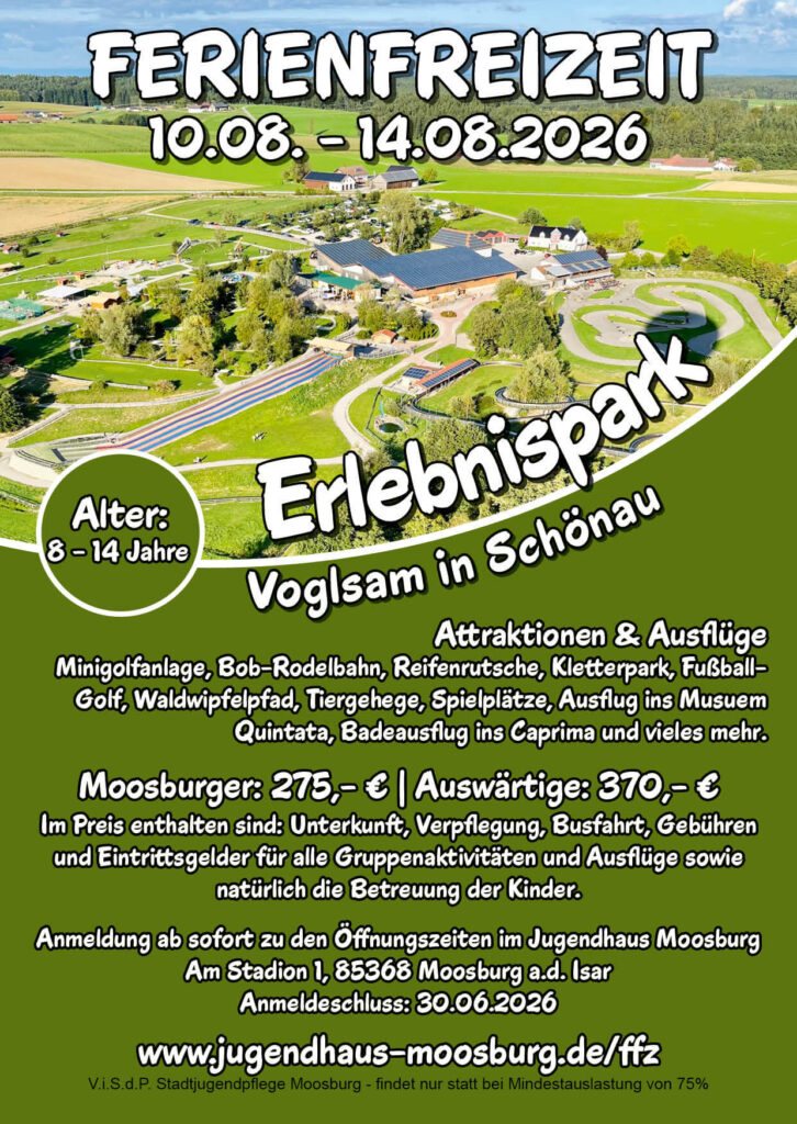 Dieses Jahr im Sommer geht es wieder auf Ferienfreizeit und zwar in den Erlebnispark Voglsam. Für mehr Infos einfach auf den Flyer klicken. Anmeldung ab jetzt zu den Öffnungszeiten im Jugendhaus Moosburg.
